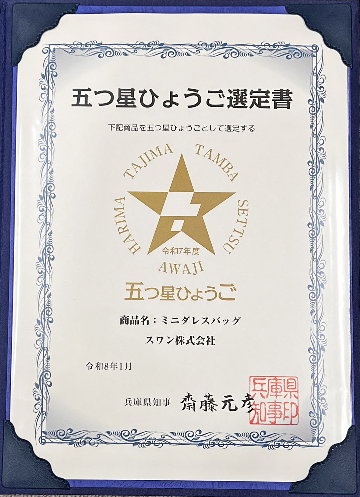 国産ミニダレス(Gem Basic)が令和7年度「五つ星ひょうご」選定品に選ばれました